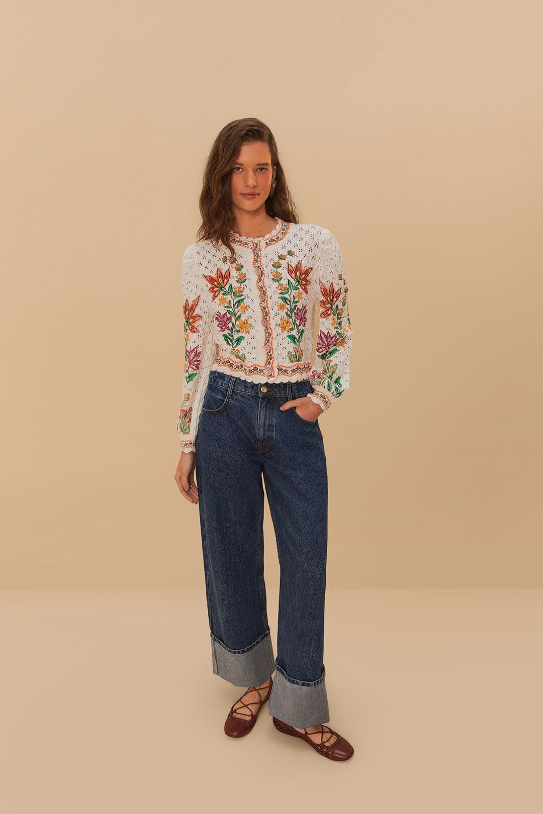 Dive into playful elegance with FARM Rio's Denim Low Waist Wide Pants. These pants boast a captivating low waist and a relaxed wide-leg silhouette, crafted from responsible materials. The rich denim color contrasts beautifully with intricate embroidery, adding a touch of vibrant artistry. Perfect for casual strolls or chic gatherings, they promise comfort and effortless style, inviting you to embrace your unique flair.