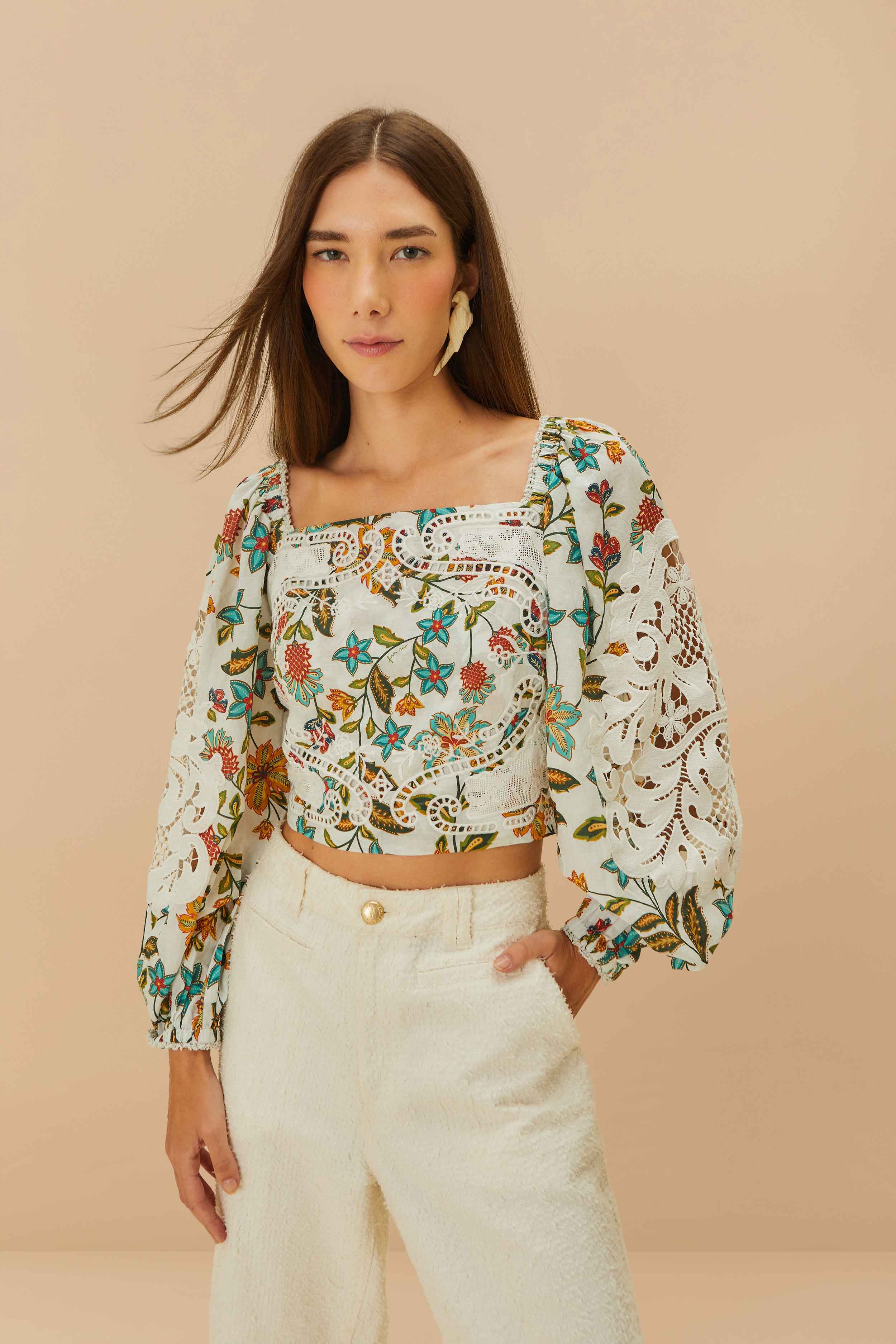 Embrace the playful charm of the Off-White Botanicals Lace Blouse from FARM Rio. This delicate piece features a square neckline, adorned with vibrant floral patterns that dance across the fabric. The blouse's enchanting lace details and airy balloon sleeves evoke a sense of whimsical elegance, making it a perfect blend of warmth and style. Add it to your wardrobe for a touch of botanical delight.FARM Rio