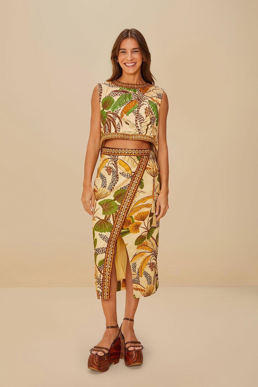 Step into a tropical paradise with the Sand Foliage Sketch LENZING™ ECOVERO™ Euroflax™ Blouse. This piece, crafted from responsible materials, features a vibrant foliage print of lush greens, warm browns, and sunny yellows. The round neckline complements the sleeveless, breezy silhouette while the playful open back adds an unexpected twist. Perfect for sunlit strolls, this blouse brings a touch of nature's whimsy to your wardrobe.