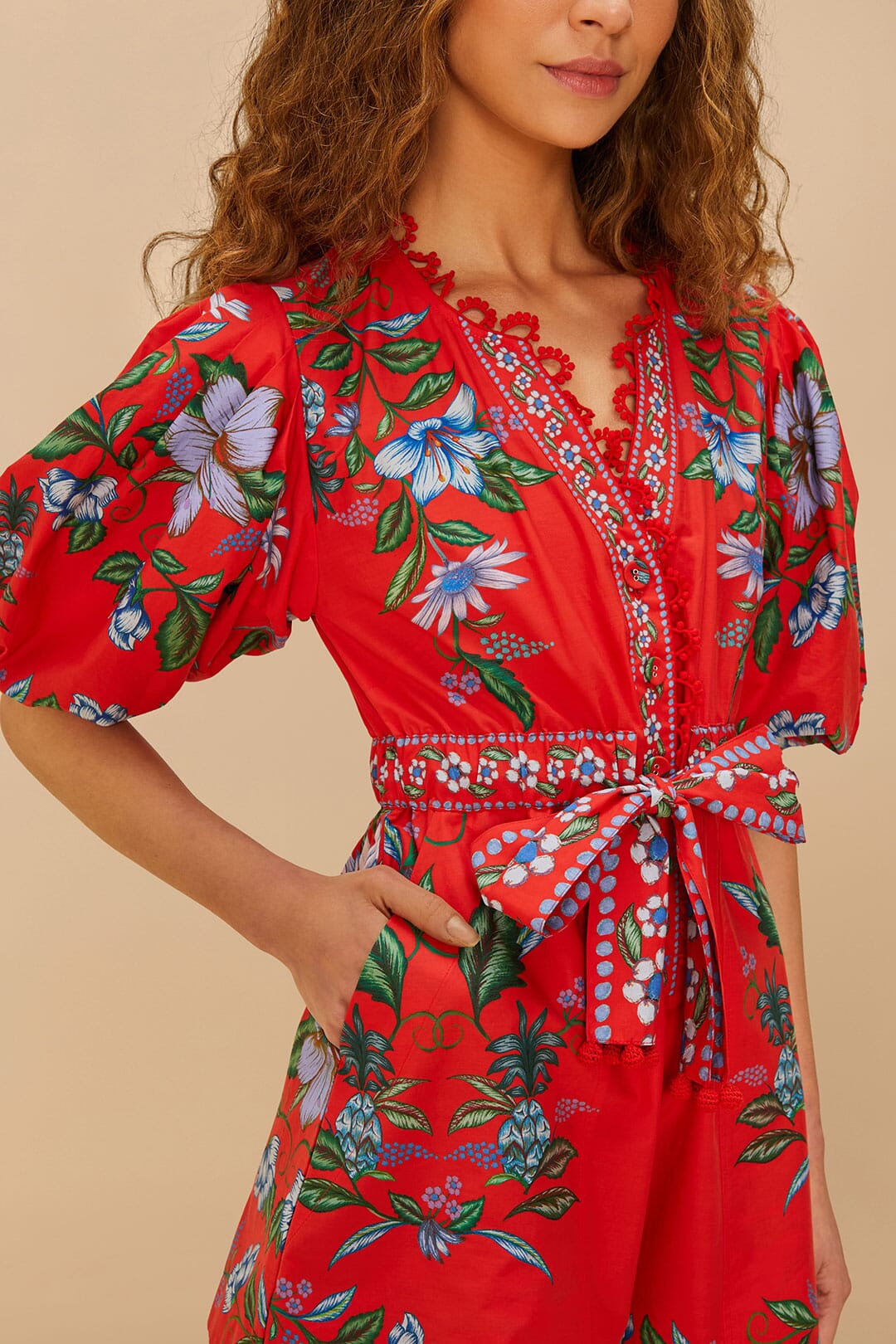 Embrace the vibrant energy of the Red Sweet Bloom Bouquet Organic Cotton Romper. This playful piece showcases a lively floral pattern that dances across the fabric, accentuated by a flattering V neckline. Crafted from responsible materials, its easy silhouette and soft texture promise comfort and style for any adventure. Let its bold colors and whimsical print transport you to the heart of a tropical paradise, celebrating life in vibrant hues. GOTS-certified organic cotton has a lower environmental impact than conventional cotton, as it reduces water usage, greenhouse gas emissions, and the amount of chemicals used.