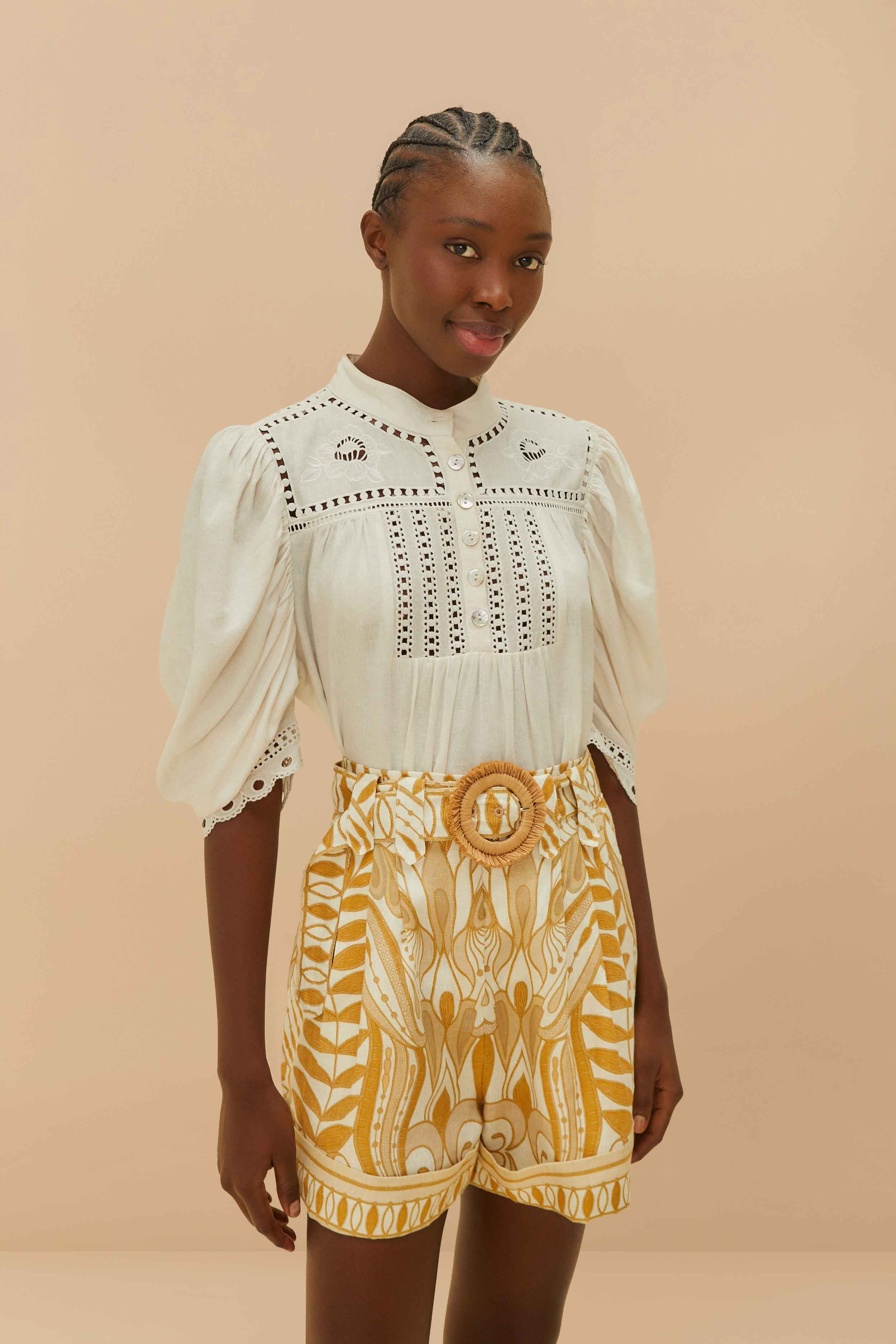 Discover the Off-White Lace Nature Shorts by FARM Rio, where playfulness meets elegance. Featuring intricate leafy patterns in rich mustard tones, these shorts are crafted from responsible materials. The tailored silhouette and high-waisted fit offer both comfort and style, while the eye-catching woven belt adds a touch of flair. Perfect for bringing an effortless charm to your wardrobe, these shorts are a delightful nod to nature’s beauty.LENZING™ ECOVERO™: the eco-responsible fibers generate up to 50% lower emissions and water impact compared to generic viscose. FARM Rio