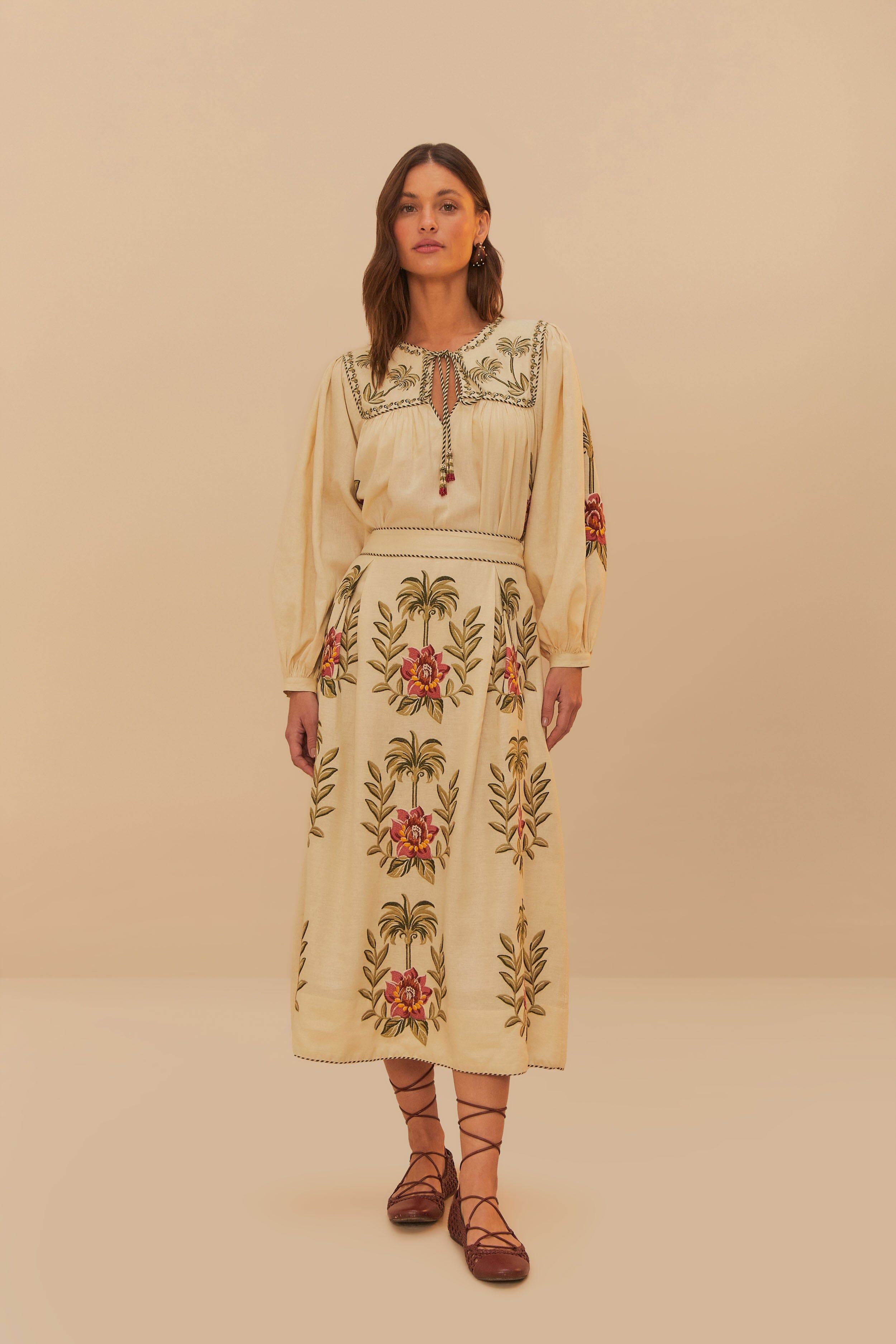 Sand Tropical Flower Embroidered LENZING™ ECOVERO™ Euroflax™ Maxi Skirt